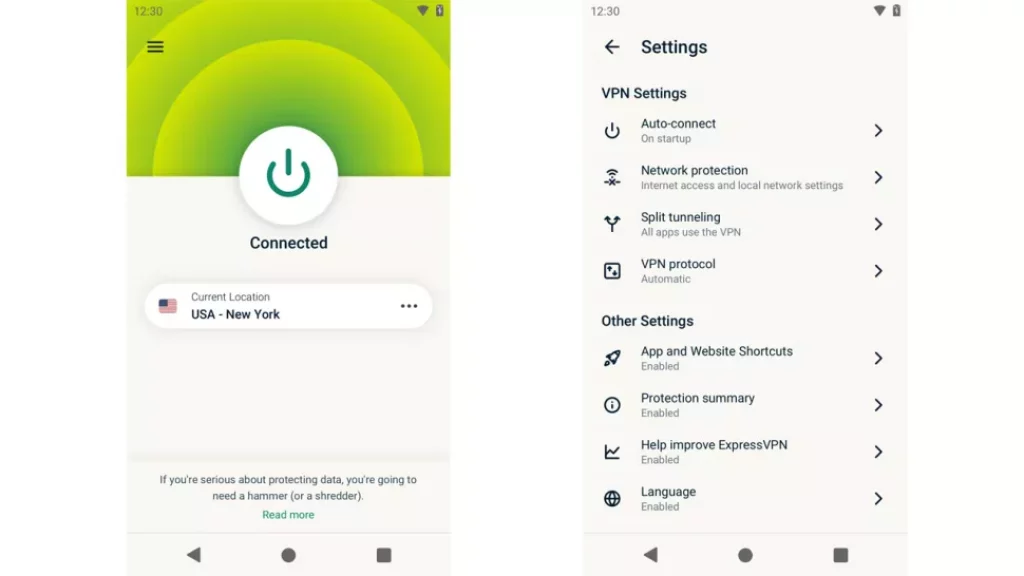 ExpressVPN is one of the best and faster VPNs for android. It offers incredible speeds for both short and long-distance. The approximate download speed is nearly 49 Mbps. Rather than this, the most crucial part is that it is reliable. With ExpressVPN, you need not face buffering problems, too, as it offers the fastest speed.